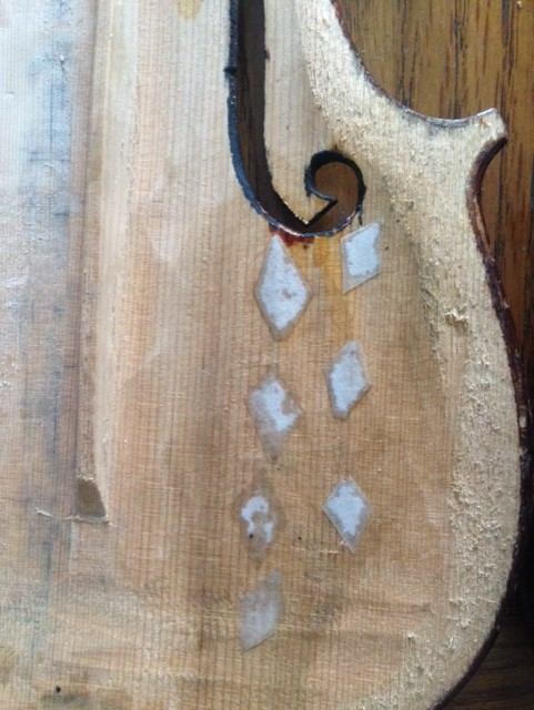 As with my other square labelled Maidstone violin, I have used traditional genuine parchment sutures to reinforce the hide-glued repaired cracks on the table of the violin. These are extremely tough, acoustic and flexible, whilst being least likely (in my opinion) to interfere adversely with the sound of the instrument.